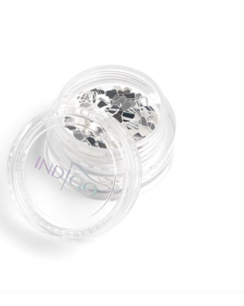 Los efectos de vidrio roto en tono plateado son pequeños elementos de forma irregular. Reflejan maravillosamente la luz con cada movimiento de la mano. El efecto aplicado en una sola uña complementará el estilismo tipo discoteca. Mirror Silver Indigo también complementará decoraciones estructurales como fantasía francesa o espejo.